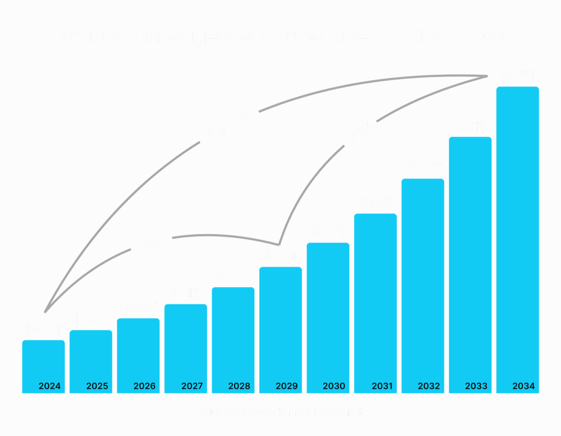 The economic potential here is that rare mix of measurable and massive. Analysts peg the global AI market at around $758 billion in 2025, expanding to $3.7 trillion by 2034. That’s a growth rate of about 19% per year, which means the next decade will look less like an adoption curve and more like a triple black diamond vertical of capital expenditure. Some forecasters think these numbers are conservative, which feels like saying Timothée Chalamet is “kinda famous.”